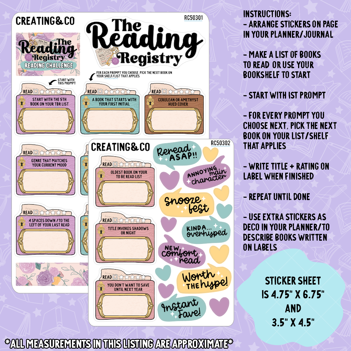 - Reading Challenge Set - 1 5x7 Sticker Sheet + 1 3.5x4.5 sticker sheet for using in your planner or journal. Comes with a "badge" sticker for keeping track of which challenges you complete throughout the year.
