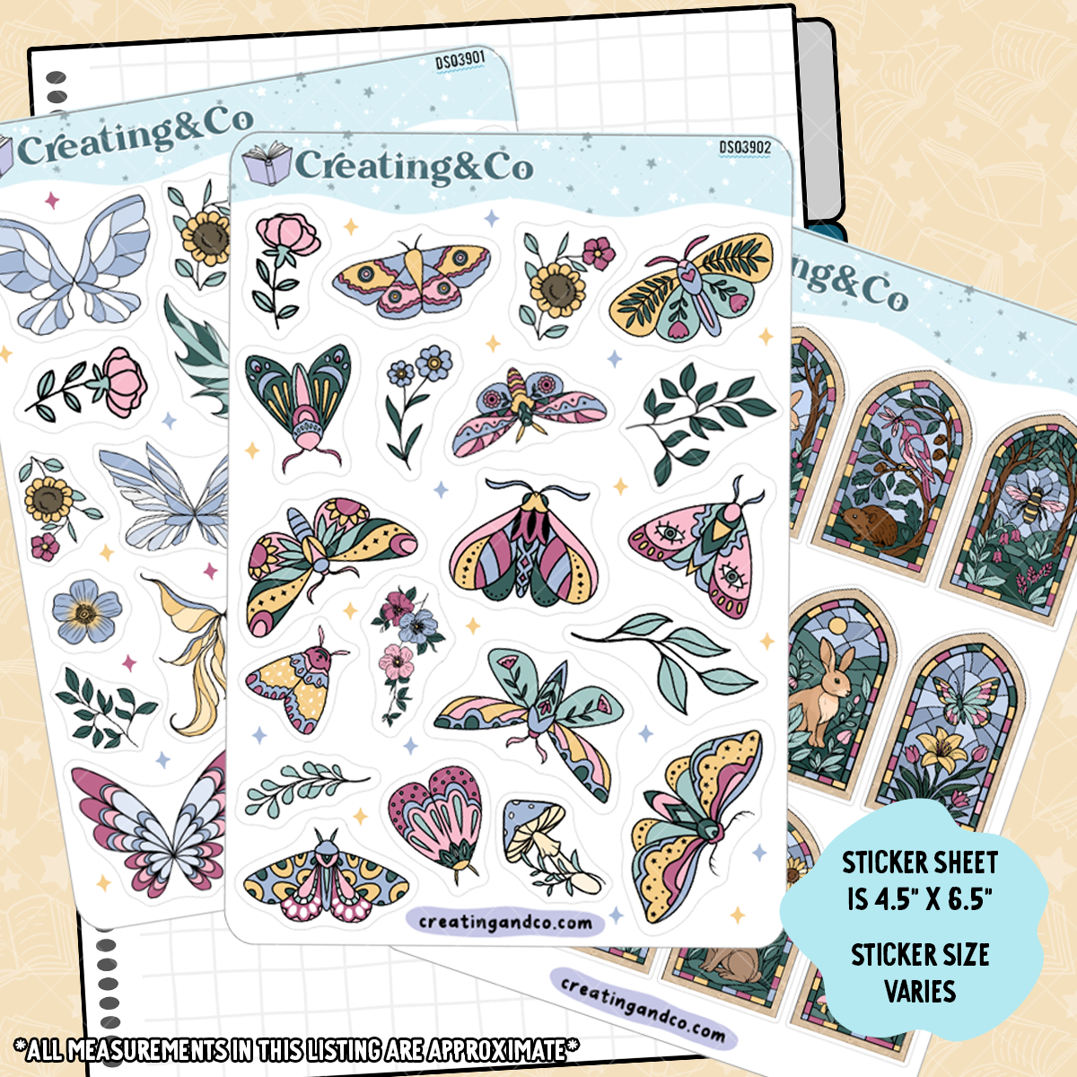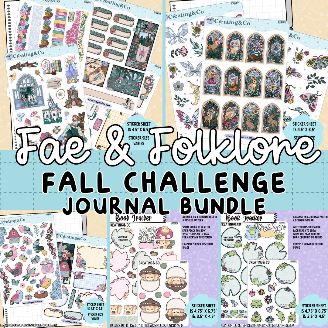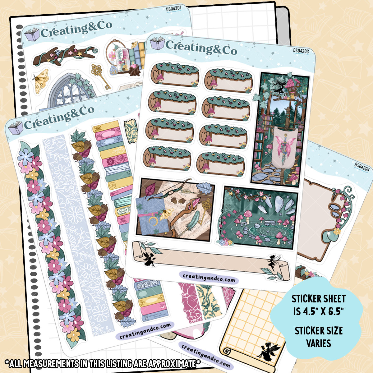 - Decorative Journal Stickers - 4 4.5x6.5 sticker sheet containing stickers for using in your journal that match the fae & folklore weekly kit theme