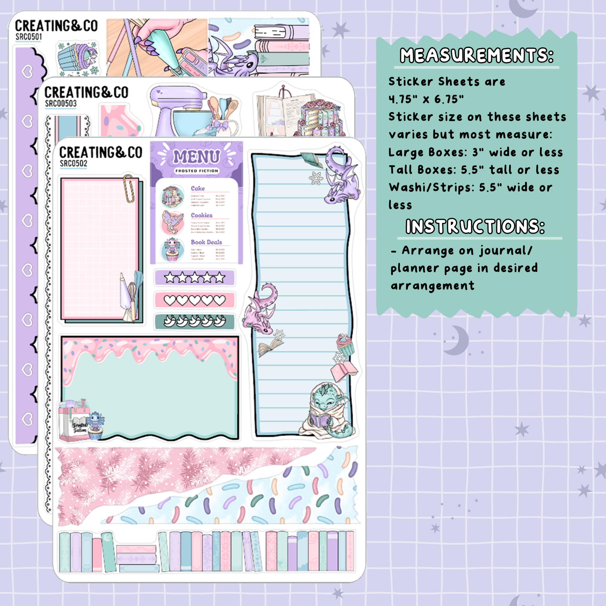 Each set is a single sheet of individually kiss-cut stickers, ready to peel and use in your planner or calendar. Each sticker sheet is 6.75'' tall and 4.75'' wide.