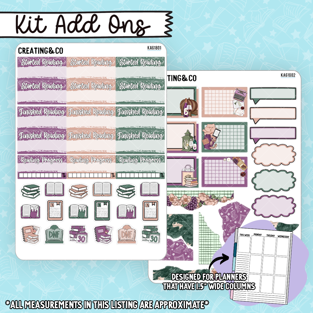 This listing is for add on sheets for our standard/vertical weekly kit! These stickers are designed to be used in 1.5" wide planners but can be used in journals or other places as well.