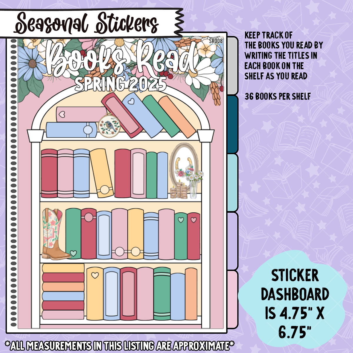 This set comes with one 4.75" x 6.75" dashboard made with our sticker paper. This means that you can hole punch it and use it as is OR you can peel the backing off to stick in your planner. It also comes with a sheet of our book and deco stickers to be used on the dashboard.