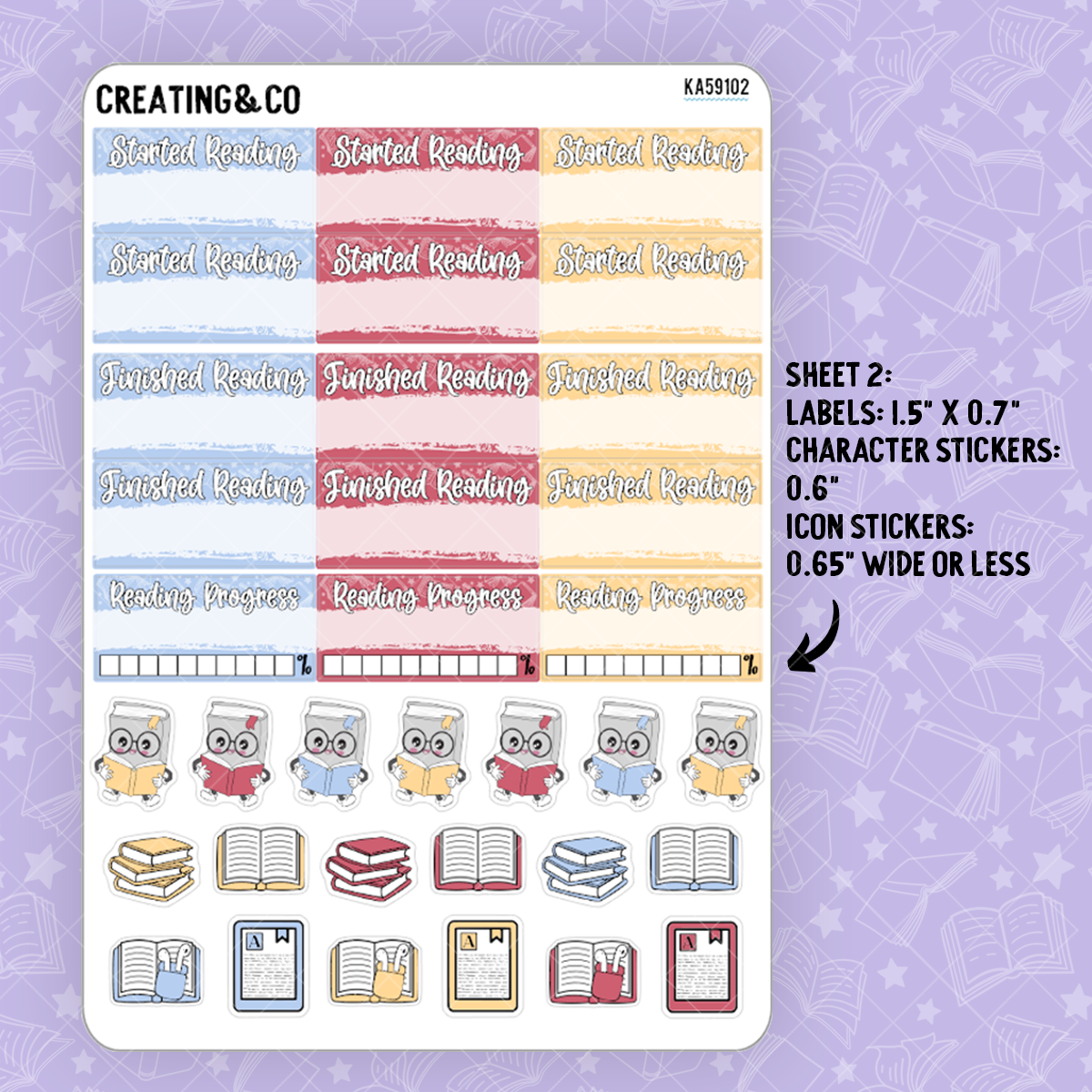 - Reading Sampler - 1 5x7 Sticker Sheets containing stickers for tracking your reading. Each set contains 34 stickers.