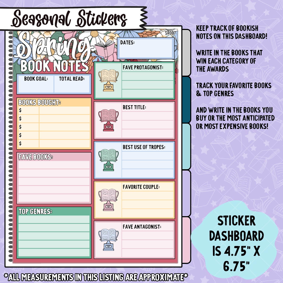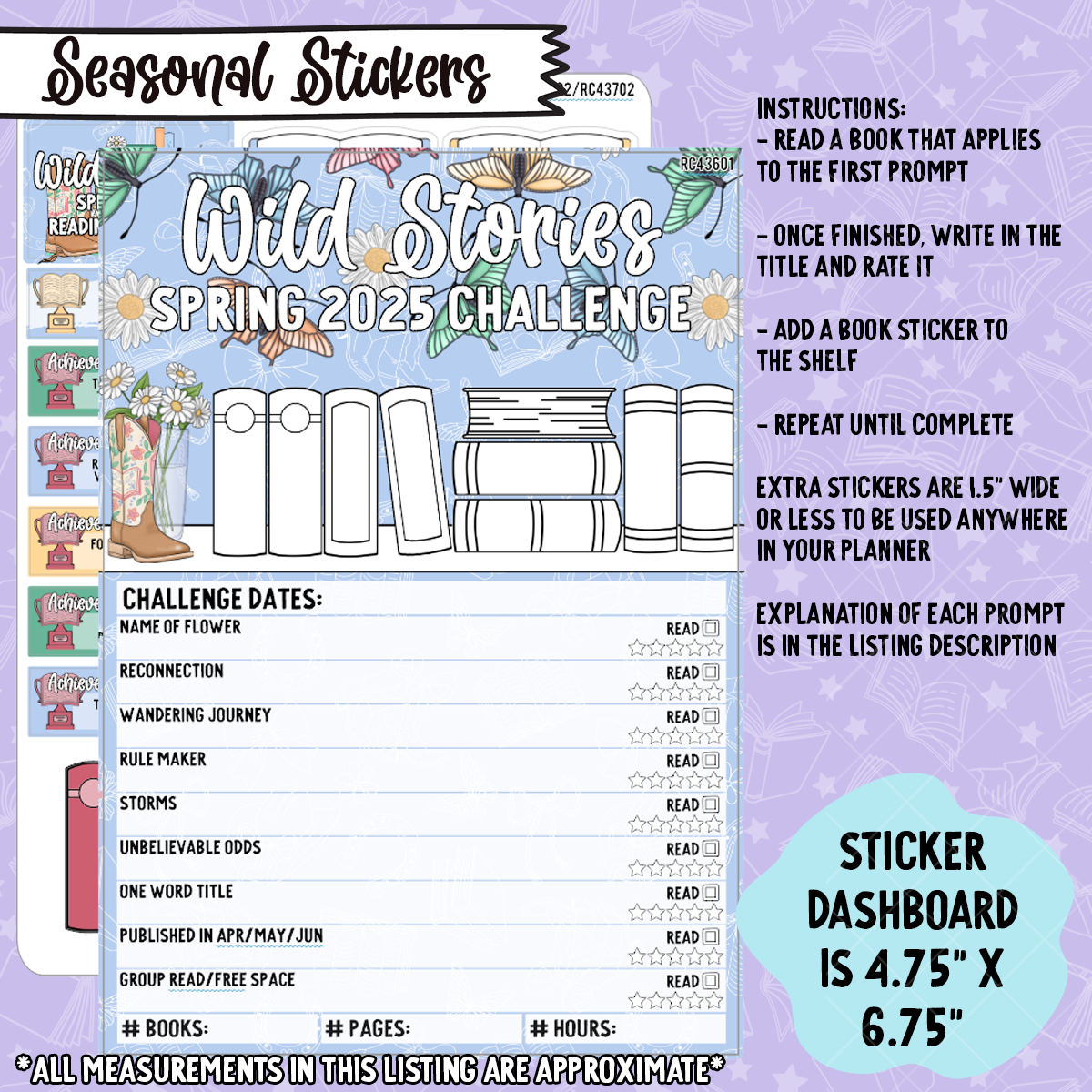 - Reading Challenge Set - 1 5x7 Sticker Dashboards + 1 5x7 sticker sheet for tracking the challenge and books read in your planner. Contains a "badge" sticker to keep track of the challenges you complete in over the year.