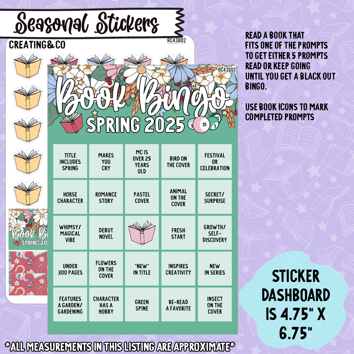 - Seasonal Bingo - 1 5x7 Sticker Dashboards + 1 5x7 sticker sheet for tracking the challenge and books read in your planner. Contains a "badge" sticker to keep track of the challenges you complete in over the year.