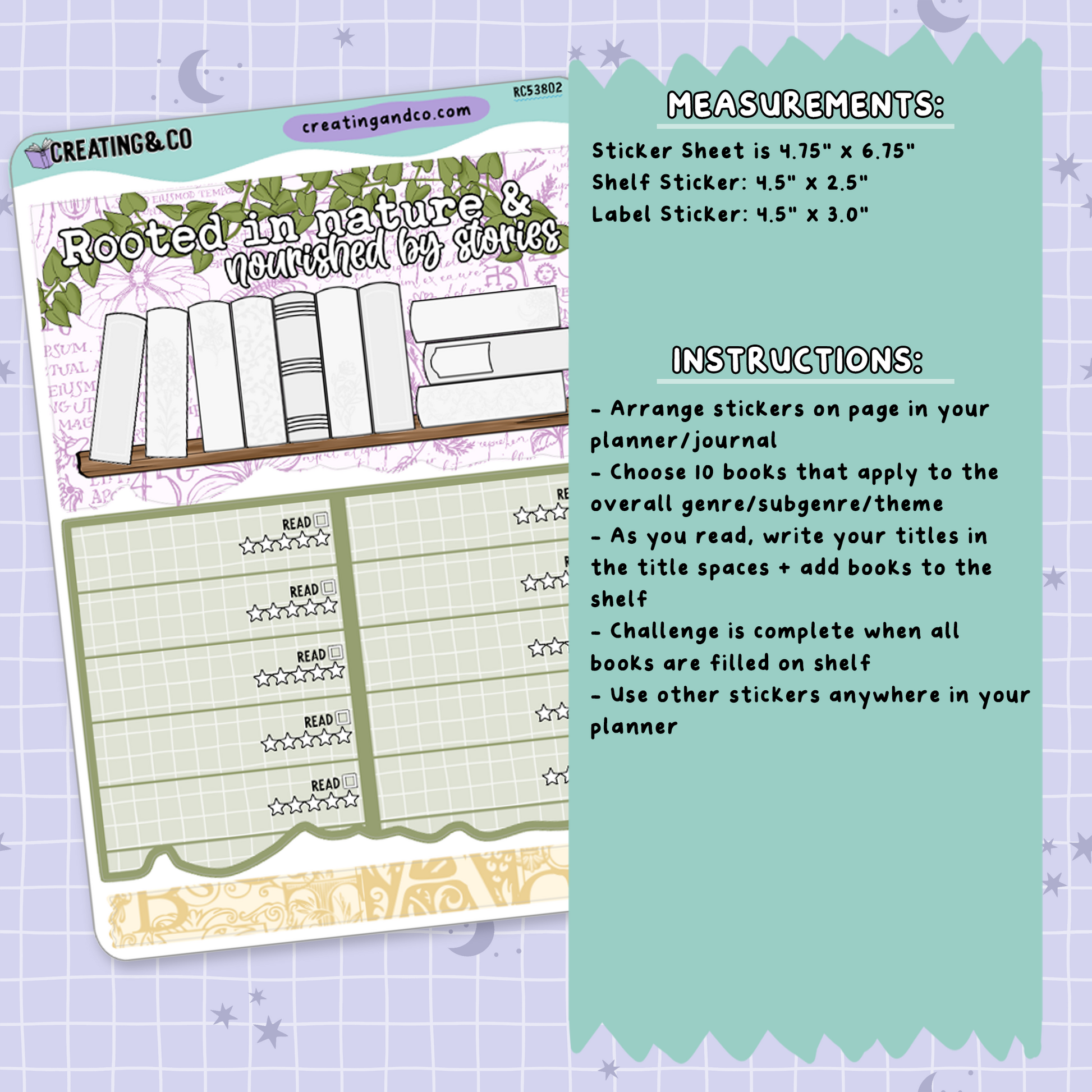Explore genres that match your mood with our reading challenges. From ghost stories to cozy reads, track up to 10 books and build your perfect shelf. This set comes with 1 4.75" x 6.75" sticker sheet made of our matte sticker paper and 1 3.5" x 4.5" sheet.